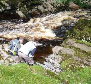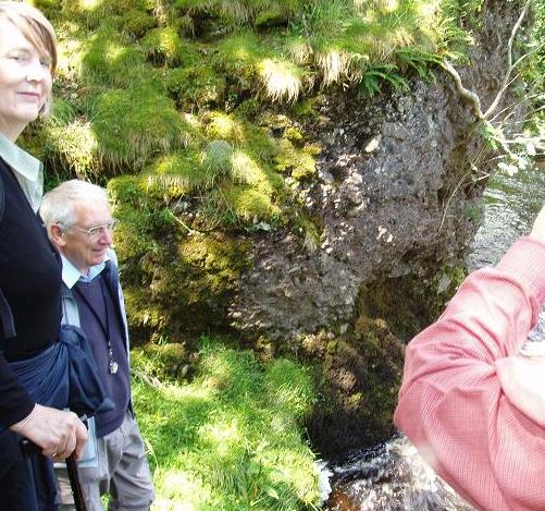 Examining junction between Tom Croft Limestone to the left and Ashell Sandstone to the right, both dippng upstream to the right. |