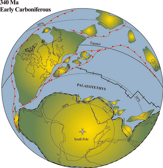 left shows position of the continents during Early Carboniferous times. From