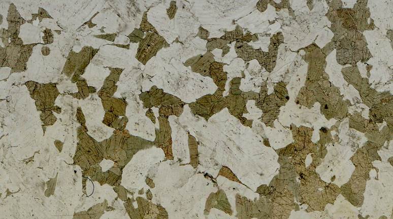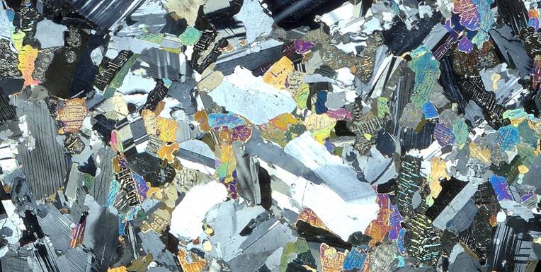 polarised light, of “Impala Black”. The minerals, ranging in colour from