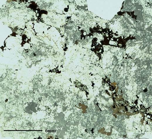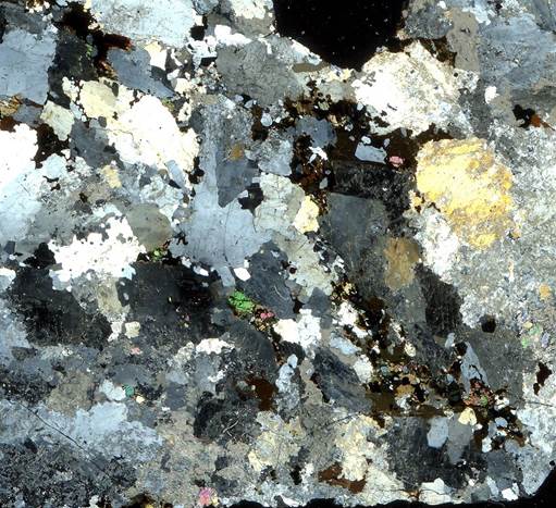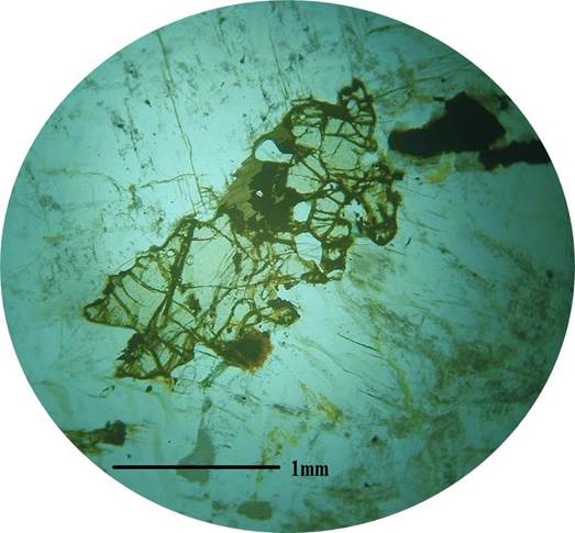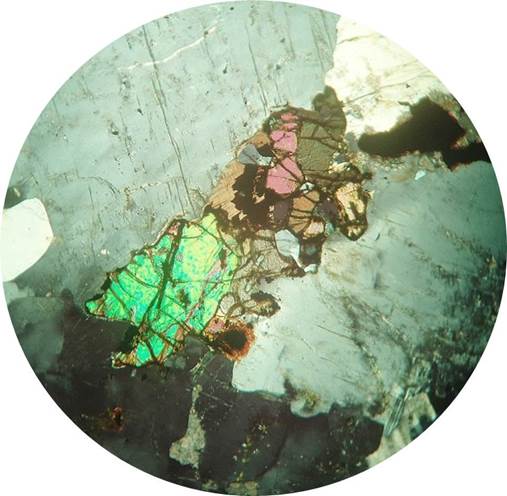 interference colours, opaque iron ore also near centre has outgrowths of lepidomelane, a variety of biotite. |