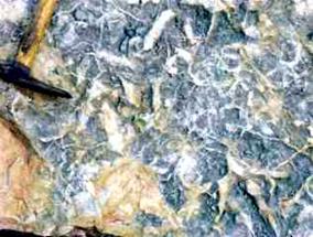 Left: Broad tridactyl footprints on foreshore sandstone, north of Cowlam Hole in Scalby Bay. To