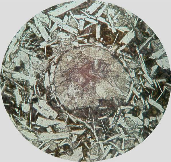 XPL The section shows laths of plagioclase feldspar (dark grey to white) and pyroxenes (yellow, brown, blue & red). The centre shows an infilled vesicle of carbonate. Some of the feldspar laths are seen to be tangentially arranged around the vesicle as a result of its expansion on release of pressure. |