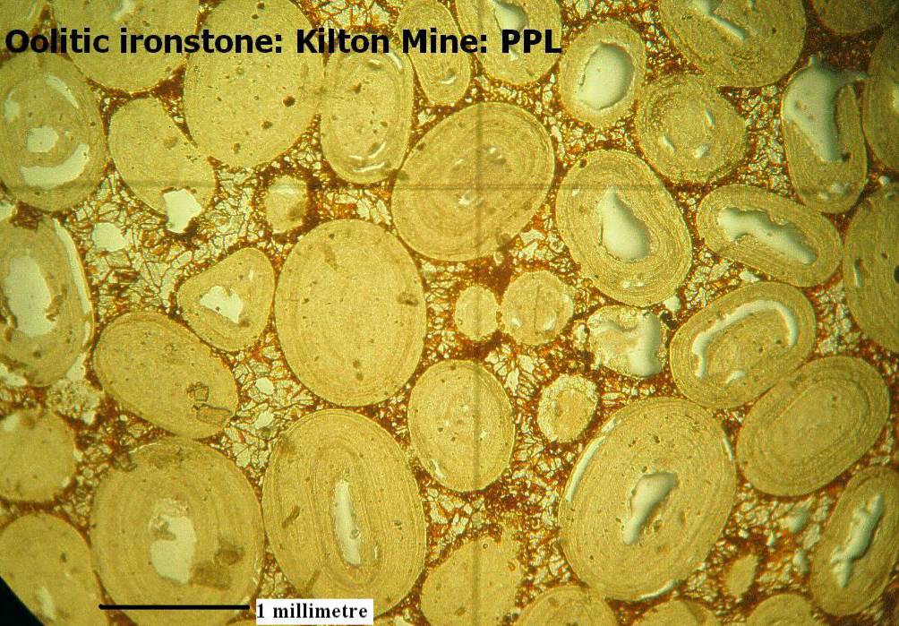 Oolitic ironstone from Kilton Mine, Grid Ref. NZ 695169, Redcar & Cleveland, UK. The plane polarised light thin section shows ooliths. Ironstone ooliths often consist of berthierine or chamosite, both iron-rich chlorites. They are often found altered to goethite, an iron hydroxide, as is probably the case here. The lighter coloured spaces found in some of the ooliths are holes made during the thin section making process. |