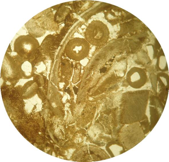 The top of the Millepore Bed is a bioclastic limestone with scattered quartz grains, the latter showing up as pale yellow, grey and white interference colours under crossed polars. The bioclasts are fragments of bryozoans, e.g. Haploecia straminea (Millepora) from which the bed derived its name as well as shell and crinoidal debris. The rounded fragments are ooliths (or ooids). These are formed by concentric layers of calcium carbonate being precipitated around a nucleus, e.g. a quartz grain, while being rolled around by the action of wave and/or tidal currents. Some ooids have a radial as well as a concentric structure due to subsequent internal recrystallisation. |