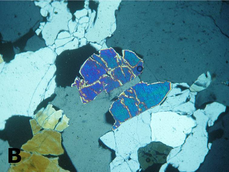their characteristic pleochroic pale blue and yellow/brown colours. C