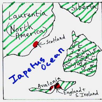 are separated from “Scotland and Northern Ireland” by the spreading Iapetus Ocean during late Precambrian, Cambrian times.