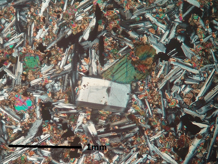 green, yellow and blue. Feldspar and orthopyroxene? phenocrysts can