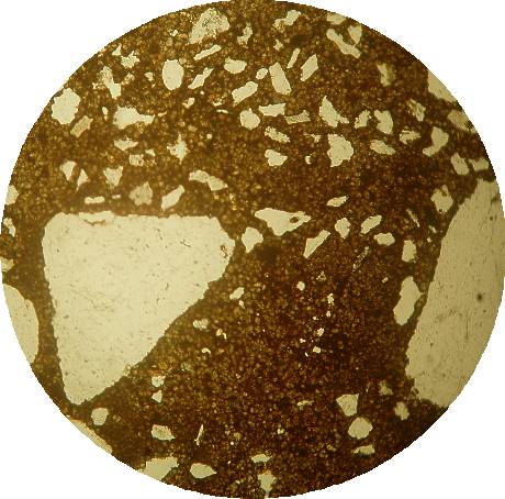 Siderite sandstone PPL: The Dogger Formation forms the base of the Middle Jurassic in the Cleveland basin. It is a complex unit, varying from shales to ooidal ironstones. The thin sections show that it consists of quartz grains "suspended" in a matrix of very fine grained siderite. |