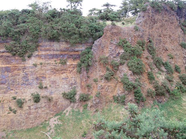 The photo on the right shows part of the dyke wall, on the right, in contact with Lower Jurassic sediments (Cleveland Ironstone Formation), on the left. Presumably part of the dyke was left there to act as a retaining wall. |