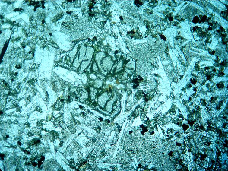 Cleveland Dyke from Wind Hill quarry (NZ 7597 0643), near Wind Hill Farm, North Yorkshire. The dyke is one of the Tertiary swarm emanating from the isle of Mull, Scotland, no doubt caused by crustal tension during the opening of the Atlantic which eventually separated North America from North Western Europe. A is a photograph of a thin section in plane polarised light. Opaque minerals of iron oxides and a cloudy cryptocrystalline mesostasis (e.g. bottom near centre) are apparent as well as a high relief mineral at the near centre. |