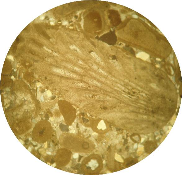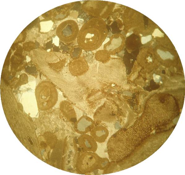 The top of the Millepore Bed is a bioclastic limestone with scattered quartz grains, the latter showing up as pale yellow, grey and white interference colours under crossed polars. The bioclasts are fragments of bryozoans, e.g. Haploecia straminea (Millepora) from which the bed derived its name as well as shell and crinoidal debris. The rounded fragments are ooliths (or ooids). These are formed by concentric layers of calcium carbonate being precipitated around a nucleus, e.g. a quartz grain, while being rolled around by the action of wave and/or tidal currents. Some ooids have a radial as well as a concentric structure due to subsequent internal recrystallisation. |
