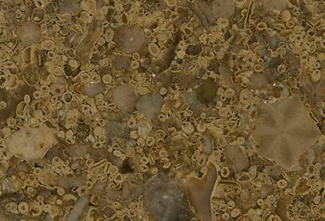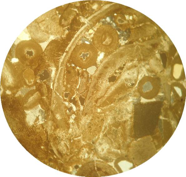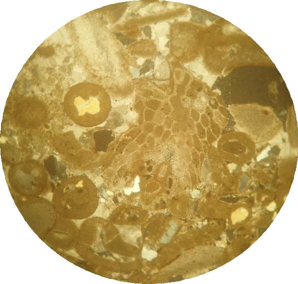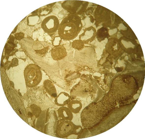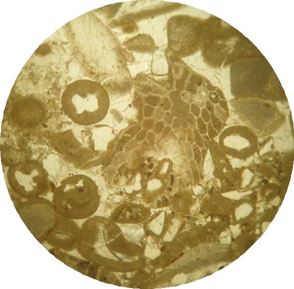 The photo' to the left is a polished section of the Millepore Bed. The hexagonal bioclast fragment, just below centre right (?crinoid ossicle) is about 3mm wide.