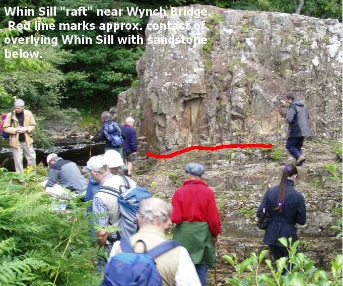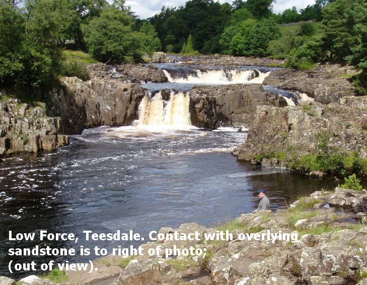 The Whin Sill forming the top of High Force Waterfall.WS = Whin Sill, S= metamorphosed sandstone, TBL= Tyne Bottom Limestone. Photo: courtesy, Derek Teasdale. Annotation: from Northumbrian Rocks & Landscape, Yorks. Geol. Soc.