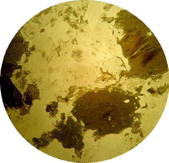 This specimen (A & B magn x50) was collected by one of our members, Mavis Gill, near Stocinis, East Harris, Outer Hebrides. (The web editor is entirely responsible for its interpretation). It is an amphibolite gneiss, i.e. a regionally metamorphosed rock composed of mainly hornblende and plagioclase feldspar. Amphibolites are formed by metamorphism of igneous rocks. The rock specimen itself shows gneissose banding in hand specimen, but here it is not very apparent. C & D are photo's taken with a scanner. |