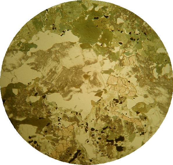 Photo B shows the same section in cross polarised light. Just north west of centre is a mineral with lamellar twinning; what appears to be a feldspar. It is, in fact cordierite. Just right of centre is a garnet. Being cubic in habit, it is isotropic, i.e. it is opaque under x polars. C and D are photo's taken under a scanner where the gneissose banding is clearly displayed and accentuated by the paler coloured minerals. |