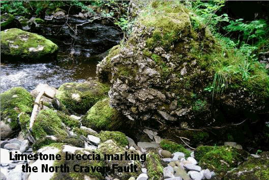 Field trip to Ingleton Falls on Sunday 11 July 2010 Leader: Gordon Liddle The aim of the walk was to examine the evidence and effects of the of the North and South Craven Faults on the southern margin of the Askrigg Block, giving rise to steeply dipping and strongly deformed turbidites, which also affected the overlying limestones. Later glacial features were also looked at. In order to appreciate the features seen it was important to consider them in the context of the geological history. The turbidites, the oldest rocks in the region known as the Ingleton Group, probably date back to the early Ordovician, and are deep oceanic sandstones and siltstones which were later deformed and compressed during the coming together of the three ancient landmasses of Avalonia, Baltica and Laurentia, and the closure of the Iapetus Ocean. The related island arc volcanic activity gave rise to subaerial volcanic deposits in these sediments and later post-Caledonian crustal extension and subsidence led to a marine transgression. Further subsidence took place leading to an increased deposition of turbidites during the final closure of the Iapetus Ocean. In the early Devonian a granite intrusion caused uplift, giving rise to a subsiding graben basin to the south and the Craven Fault belt. After meeting in the car park of the Thornton Force Waterfalls Walk in Ingleton the walk begins with a traverse across the flood plain alluvial deposits of the River Twiss laid down since the last Ice Age. As we head north and cross the South Craven Fault the path begins to rise as we enter the beautiful wooded gorge of Swilla Glen, the river cutting down into the massive basement limestones of the Lower Carboniferous Coal Measures, now on the upthrow of the fault. We noted the south facing dip of the thick limestone beds, decreasing as we headed towards the core of an anticline. The limestones now formed the wall of the glen, probably once part of an ancient cave system which became unroofed. It was possible to examine the uneven upper and lower surfaces of individual beds representing a break in deposition due to isostatic sea level changes during this time. The limestones were rich in shell debris with corals common at the top of the beds indicating tropical seas. Ripple marks were visible on the undersurfaces of the overlying beds. There was evidence of solution tubes in the massive limestone, and present day springs gave rise to tufa deposits. We crossed Manor Bridge into Pecca Glen, where the river follows the North Craven Fault line. On the west bank of the river shales are faulted against calcareous limestones on the hanging wall of the fault, with an adit, the result of an earlier attempt to explore the mineralisation. Evidence of the North Craven Fault could be seen up the hillside as a series of lystric faults. The route of the path now traversed the deformed rocks of the Lower Paleozoic terrain of the Craven Inlier, where exposures of turbidites chaotically mingle with the intensely deformed, steep dipping beds of the Ingleton slates. We passed several waterfalls, still fairly full despite the recent drought, and crossed Pecca Bridge. Here we temporarily left the path to clamber over the green-grey cleaved Ingleton Slates in a quarry beside the river. We picked our way down the scree slope of the quarry to the river in search of the narrow fault zone of the North Craven Fault, and were quite relieved when we finally stumbled across it exposed in the river bank. Here we found some spectacular fault breccia in the boulders, where, to the north of the boundary it comprised sharply angled slates, and to the south was the respective limestone breccia. We considered this short but adventurous excursion well worthwhile, and would probably not have been possible had the river been in full spate. Lunch time now called, and we finally emerged from the glen to our lunchtime venue overlooking the splendid cove formed by Thornton Force. The waterfall was sparse, reflecting the recent dry spell, but it allowed us to examine the unconformity exposed by the waterfall, where subhorizontal limestones with a conglomerate base rest on top of the more massive looking turbidites of the Ingleton Group and the steeply dipping laminated basal siltstones. The time gap represented by the unconformity between the Carboniferous and the Palaeozoic basement is indeterminate, and is emphasised by the undercutting of the limestones due to preglacial erosion. We stood on the Ingleton Group by the plunge pool and searched for a rather inconspicuous dyke we knew was there. After lunch we continued on the path upwards, over Raven Ray, a Devensian terminal moraine which once blocked a huge glacial lake occupying Kingsdale. Indeed, evidence of the preglacial river bed could still be seen as a dip which descended the western side of the moraine into the plunge pool. As we rounded the summit of Raven Ray we caught a glimpse of the spectacular limestones of Keld Head Scar in Kingsdale. At this point we turned right and crossed Raven Ray footbridge over the River Doe, following the return path of this delightful circular walk, passing Beezley Farm and Beezley Falls, admiring the cascading series of the Snow Falls, discussing some of the features of the Craven Fault belt system and its associated structures as we went. It was an interesting and well worth while walk, from both the visual and geological point of view. Kindly supplied by Mavis Gill Top of page |