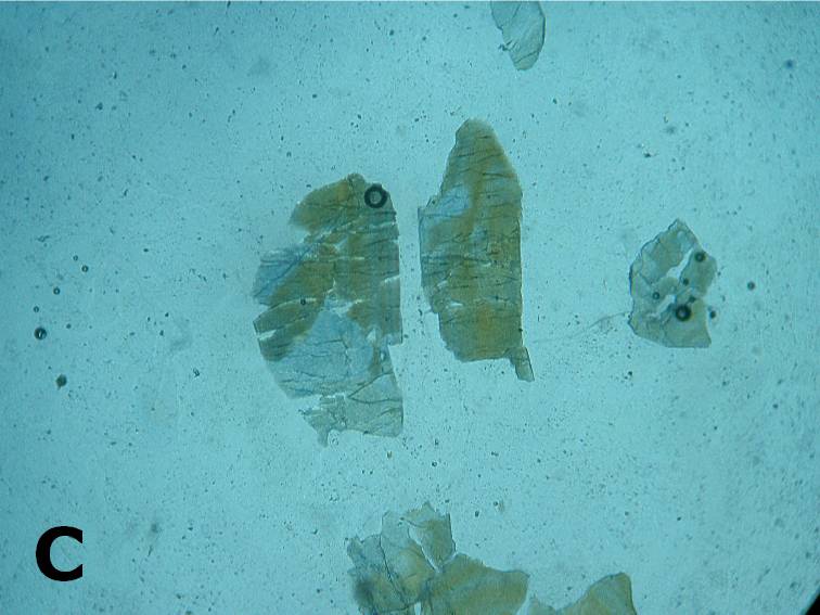 their characteristic pleochroic pale blue and yellow/brown colours. C