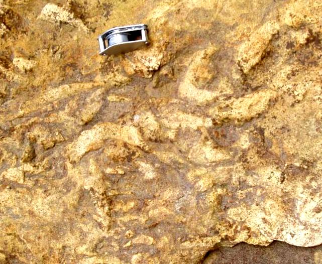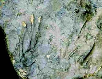 After scrambling over cliff fall boulders the party examined another block containing at least one tridactyl (three toed) print, cf. pictureon above. The print is just to the right of the hand lens. Additionally, there are several other marks of an indeterminate nature. The tridactyl print would belong to the B group. |