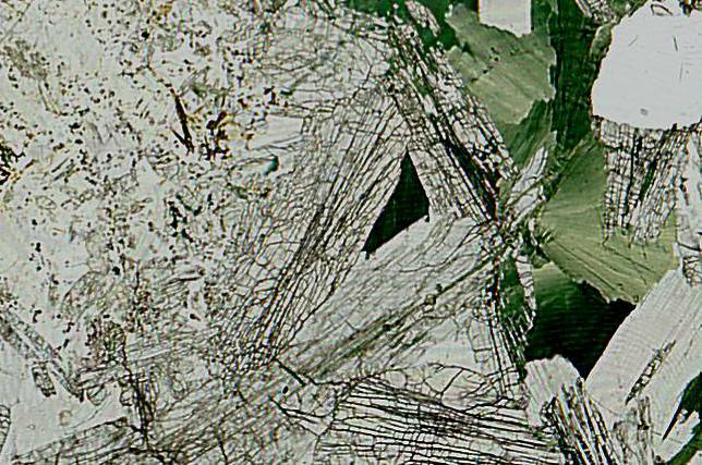 specimen in plane polarised light. The green mineral with a radiating